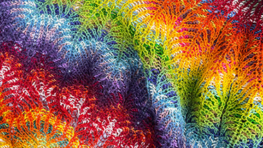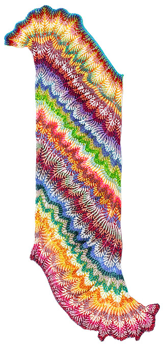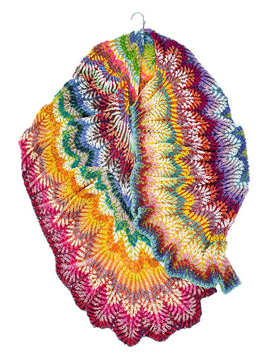 A soft cocooning shawl or giant scarf with an airy texture and feathery fans of color. The shape is a irregular parallelogram which sits comfortably on the shoulders and is fun to drape and style - you can play with the arrangements of curves, chevrons and colors.