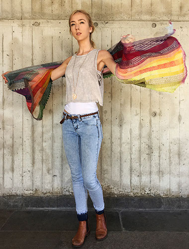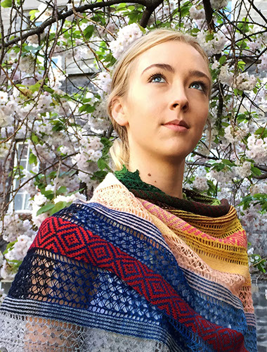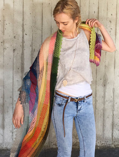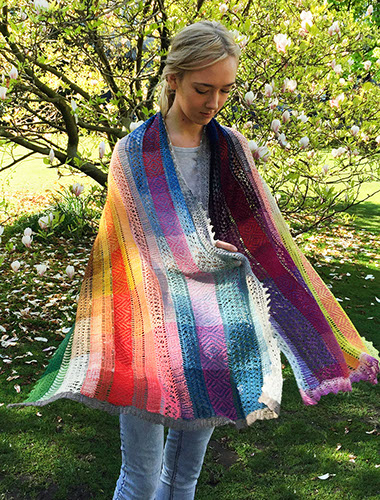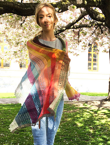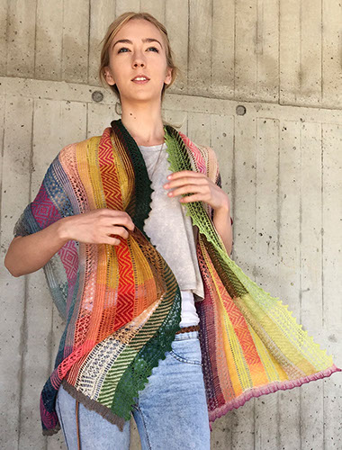A large lightweight rectangular shawl with stripes of lace and stranded knitting in a patchwork of harmonizing naturally dyed colors.