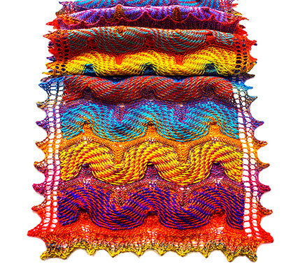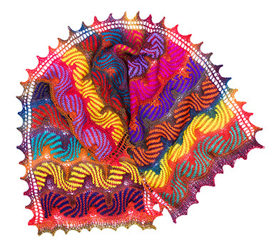 A tropically colored, richly textured scarf or shawl pattern, with lace stitches and stranded knitting enlivened by unusual increases and decreases.