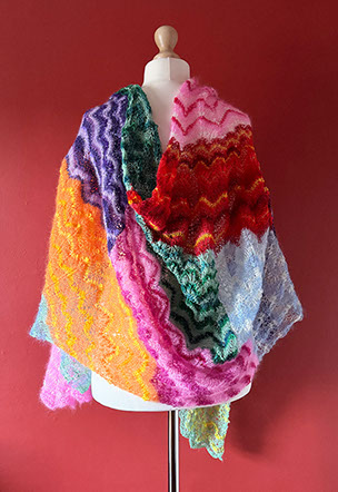 Fans of chevrons fit together neatly in this colorful creative shawl and scarf pattern. The fan shapes are worked in intarsia with two colors per row. Mixing yarns of differing weights creates various degrees of transparency and drape.