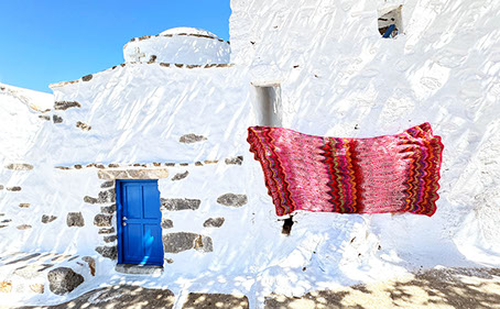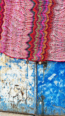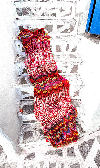 A giant shawl (or small blanket) with graceful lines and an enveloping warmth. The pattern is inspired by stylized pomegranates and the color distribution is influenced by ikat and tie-dyed textiles.