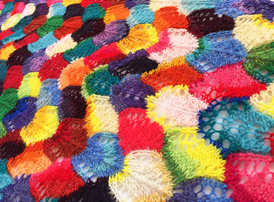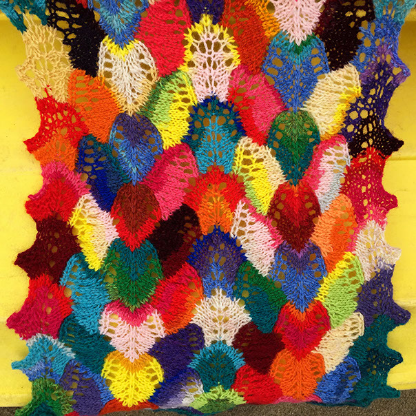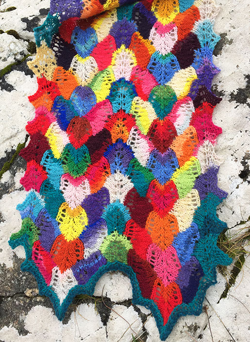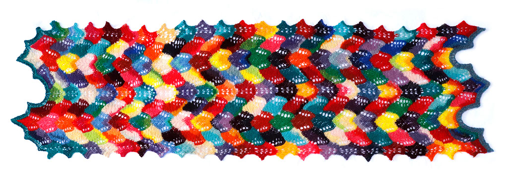 Bands of intarsia are twisted into zigzags by simple lace stitches - the dabs of color (each requiring less than 2m/2yds of yarn), are squished and rotated into irregular shapes by the increases and decreases.