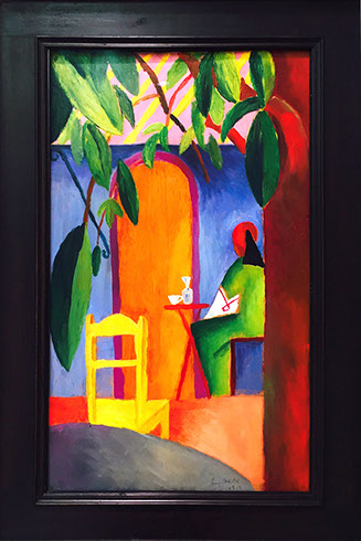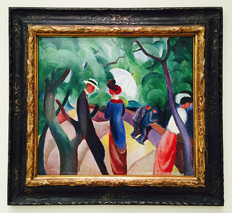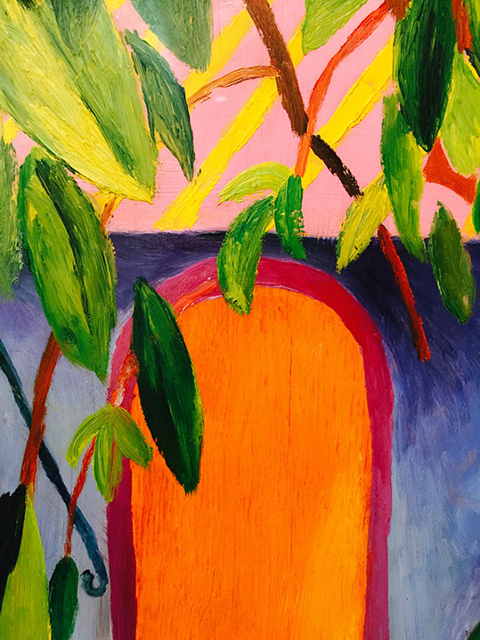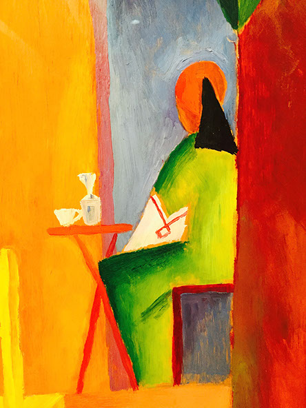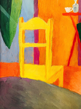 A vibrant scarf or shawl pattern inspired by patches of lustrous saturated color in the paintings of German artist August Macke.