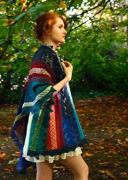 Techniques include back and forth stranding, intarsia and lace knitting, with 6 colors in each row.