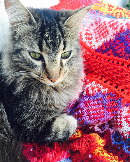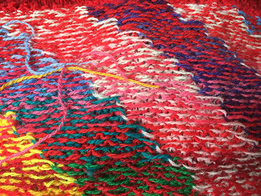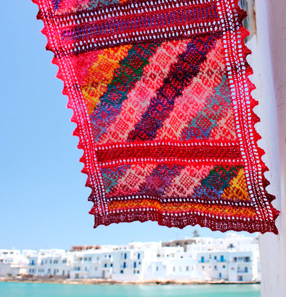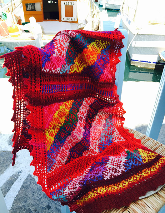 An interesting knit - techniques include lace knitting, stranding, intarsia & trapping, with up to 6 colors in each row.