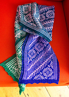 The pattern evolved as I knit the sample - I started knitting at the green end with diagonals of corrugated ribbing separating the bands of circular flower motifs. Diagonals of reverse stranding were introduced about a third of the way along - the blue end of the scarf shows the final version of the pattern.