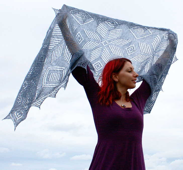 The pdf includes charts and instructions for the pattern as pictured here, and charts and instructions for a rectangular version with a zigzag lace border and plain edges.