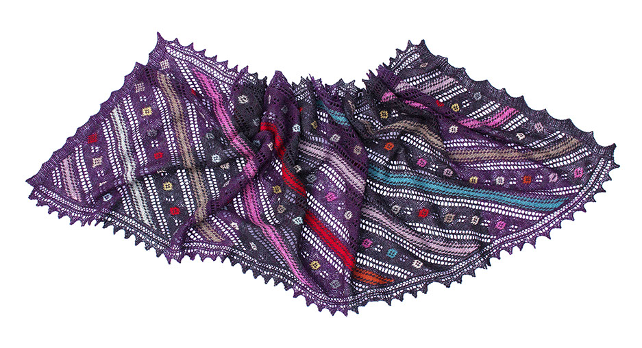 A large rectangular shawl with diagonal stripes of lace and intarsia - the colorful combination of small motifs and large dramatic stripes is inspired by Turkish textiles.
