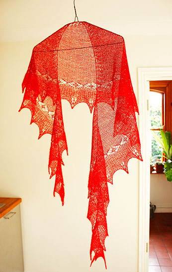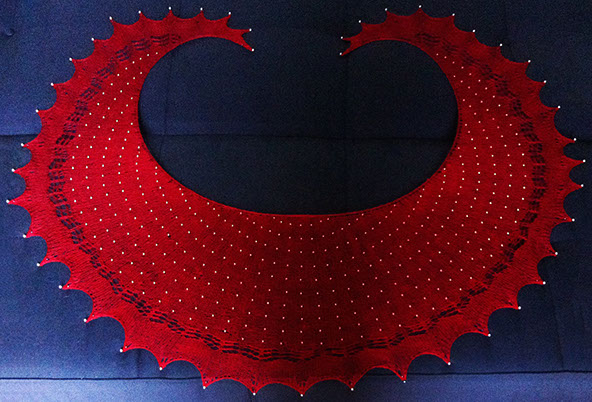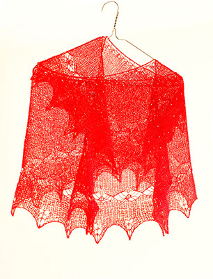 A dramatic beaded shawl in red and gold. The shape is a shallow crescent knit top down, starting from a single stitch. The finished version of this pattern is a synthesis of the three versions pictured here - it has the radiating beaded upper section, the shallow diamond border, and an additional row of eyelets between the diamonds and the outer border.