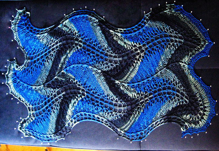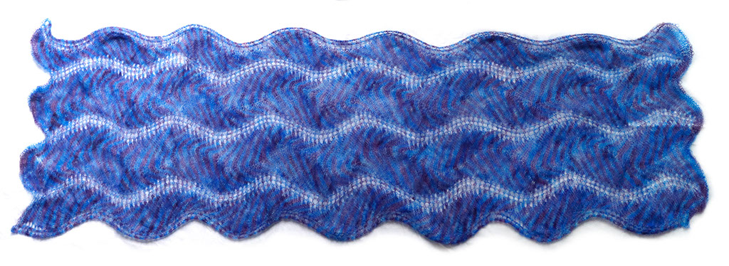 The 2017 sample was knit on 5mm/US8 needles with 2 skeins, 100g, 840m of Fibre Kitchen 72% kid mohair 28% silk lace yarn, elderberry colorway. Dimensions: approximately 44cm/17.5ins wide by 180cm/72ins