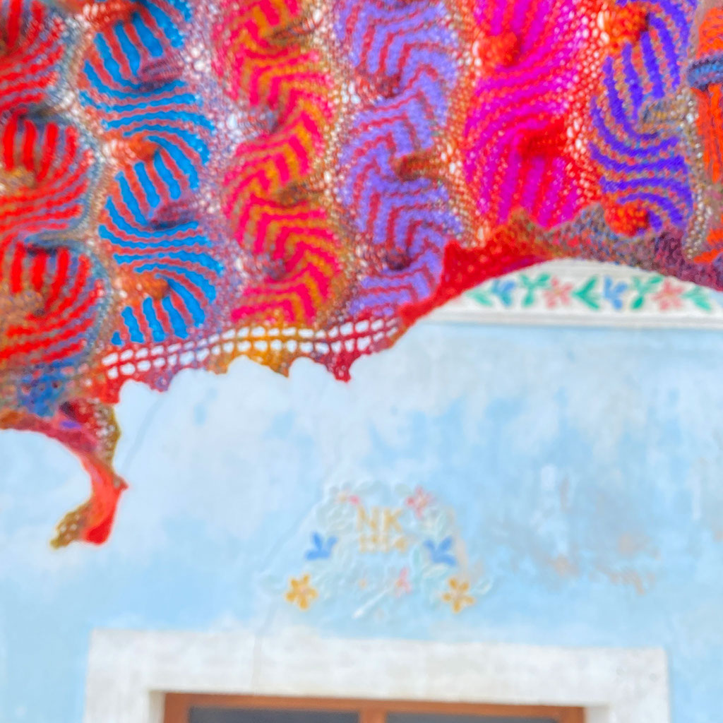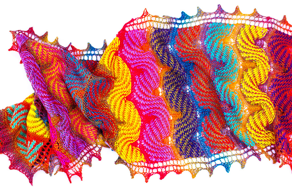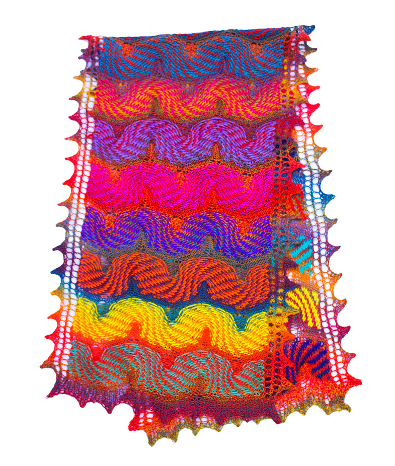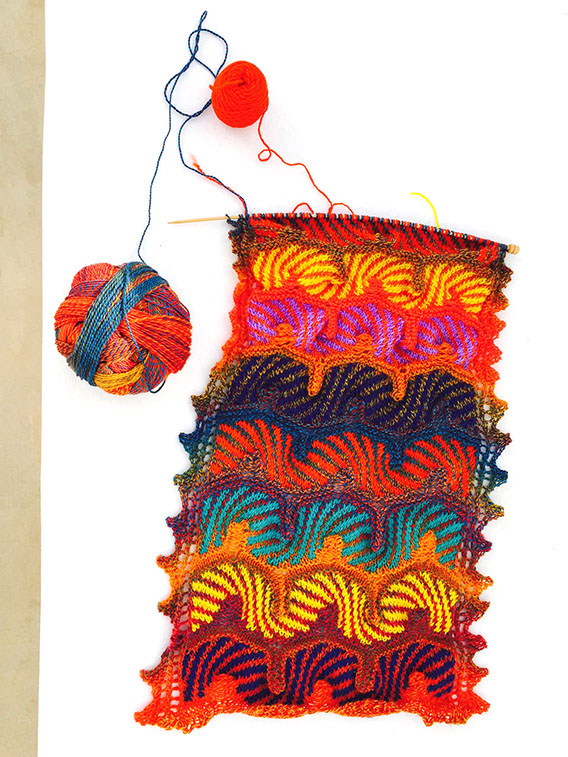 A tropically colored, richly textured scarf or shawl pattern, with lace stitches and stranded knitting enlivened by unusual increases and decreases. This pattern uses stacked increases and decreases and assumes that you are familiar with the techniques! The right side (below) and wrong side (above) are both interesting.
