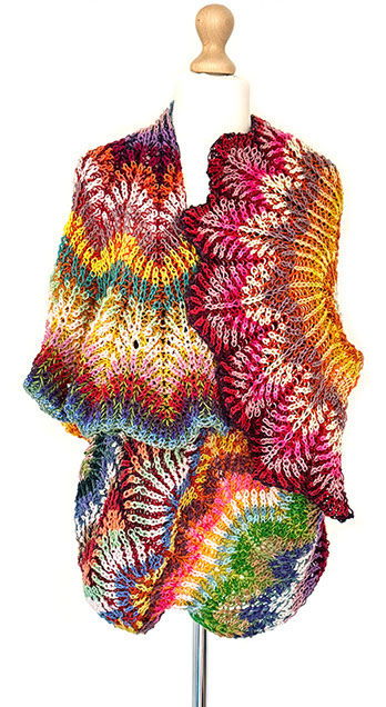 A soft cocooning shawl or giant scarf with an airy texture and feathery fans of color. The shape is a irregular parallelogram which sits comfortably on the shoulders and is fun to drape and style - you can play with the arrangements of curves, chevrons and colors.