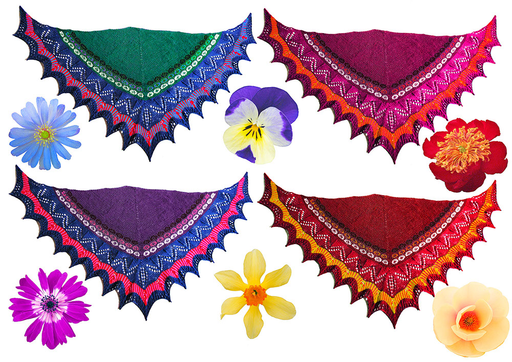 A colorful triangle combining stranded and lace knitting. The stranding is done back and forth and is worked quite loosely to create a more open texture than normal. The stranding features small flower motifs and petal-like stripes in the outer border. It is a good project for being creative with your favourite colors. I’ve called it Mercato dei Fiori (flower market) after a Patti Pravo song I first heard when I lived in Italy.