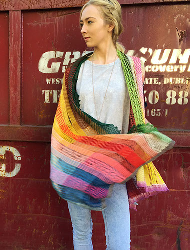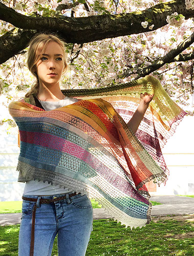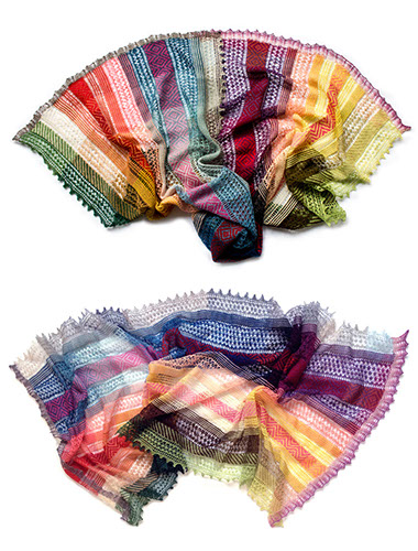A large lightweight rectangular shawl with stripes of lace and stranded knitting in a patchwork of harmonizing naturally dyed colors.