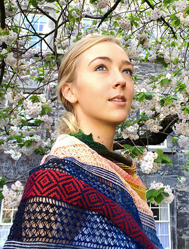 The sample shawl was knit on 2mm/US0 needles with the Renaissance Dyeing Main Range (now the Lã nollin Main Range): 75 x 25m/27yd skeins of artisan yarn, hand-dyed with traditional natural dyestuffs by Lã nollin in Isère in the French Alps.