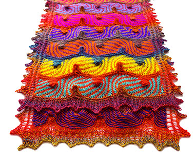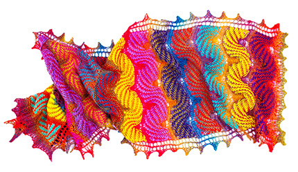 A tropically colored, richly textured scarf or shawl pattern, with lace stitches and stranded knitting enlivened by unusual increases and decreases.