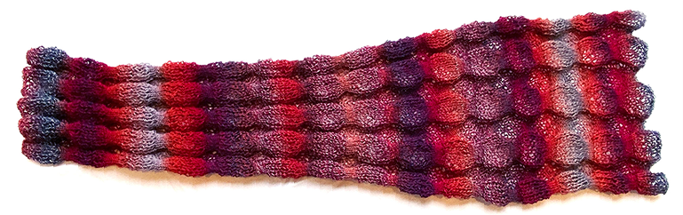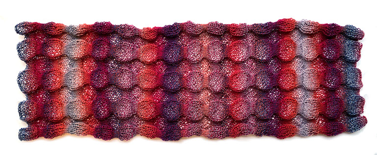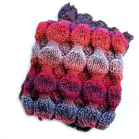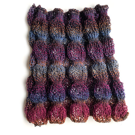 A textured stitch pattern with ribbing and drop stitch bubbles, ideal for warm scarves, wraps, shawls, afghans, blankets or throws. The base of ribbing adds a deep three dimensional structure to the fabric, with strong shadows and highlights. The sample scarf was left unblocked to preserve the texture. The columns of bubbles stretch apart to varying degrees when the shawl is handled and worn. This effect is more apparent in bigger projects with the extra weight of the fabric. This is a completely reversible stitch pattern.