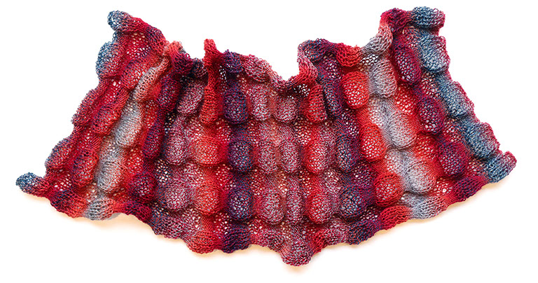 This stitch pattern eats up a lot of yarn! The scarf shown here requires one ball of yarn. Allow two or more balls for a larger project. There are two variations of the pattern, one with symmetrical side edges (main photos), and the other with asymmetrical edges (see swatch in darker colorway below).
