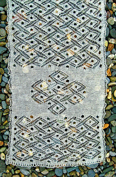 All rows are knit, with yarn overs & decreases on most rows. The “bobbles” are formed using triple yarn overs. The end and center knots can be extended to make a longer stole.