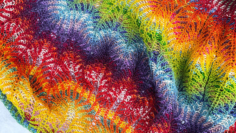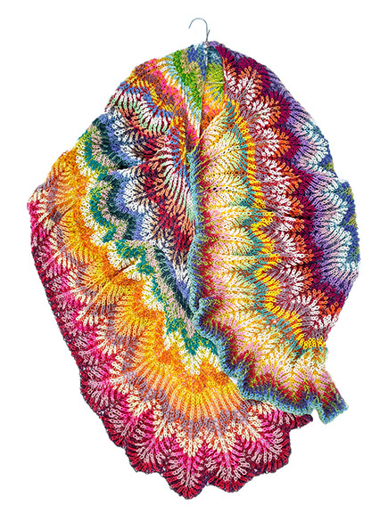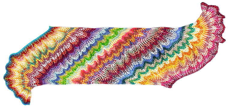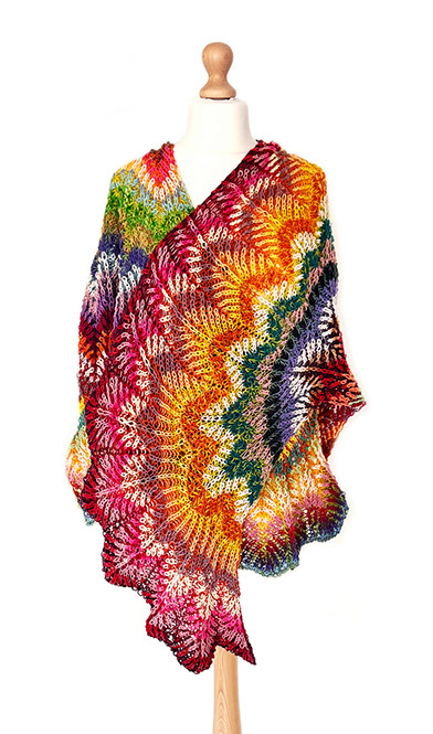 A soft cocooning shawl or giant scarf with an airy texture and feathery fans of color. The shape is an irregular parallelogram which sits comfortably on the shoulders and is fun to drape and style - you can play with the arrangements of curves, chevrons and colors.