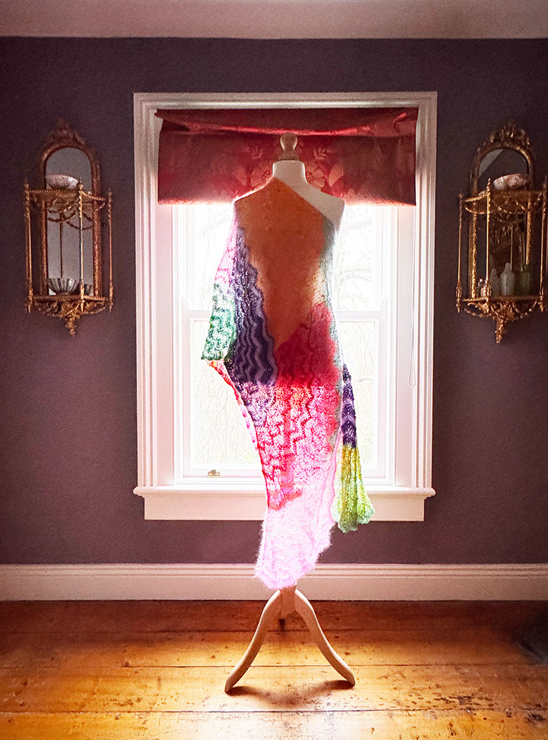 The smaller version was knit on 6mm/US10 needles using approximately 760yds/700m of yarns of different weights.