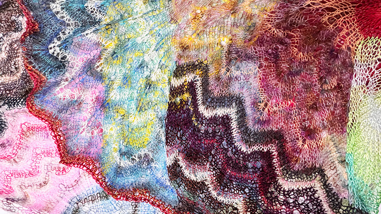 Fans of chevrons fit together neatly in this colorful creative shawl and scarf pattern. The fan shapes are worked in intarsia with two colors per row. Mixing yarns of differing weights creates various degrees of transparency and drape.
