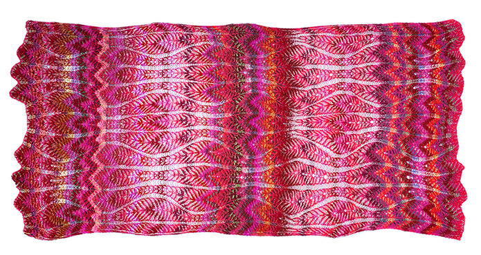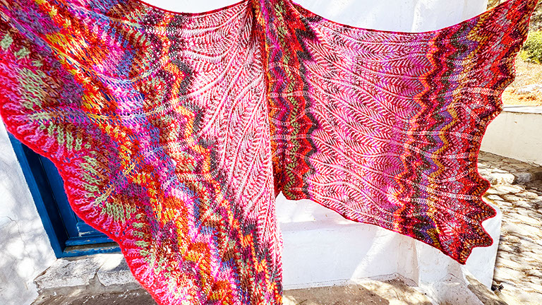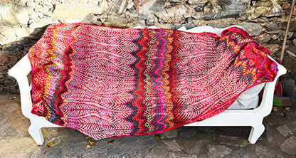 A giant shawl (or small blanket) with graceful lines and an enveloping warmth. The pattern is inspired by stylized pomegranates and the color distribution is influenced by ikat and tie-dyed textiles.